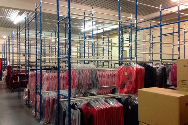 Bulk apparel production with consistent sizing and quality control.
